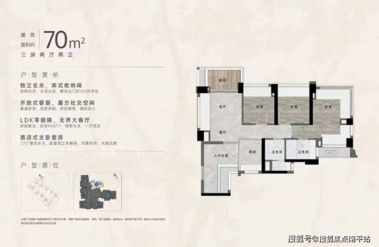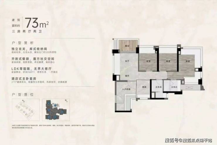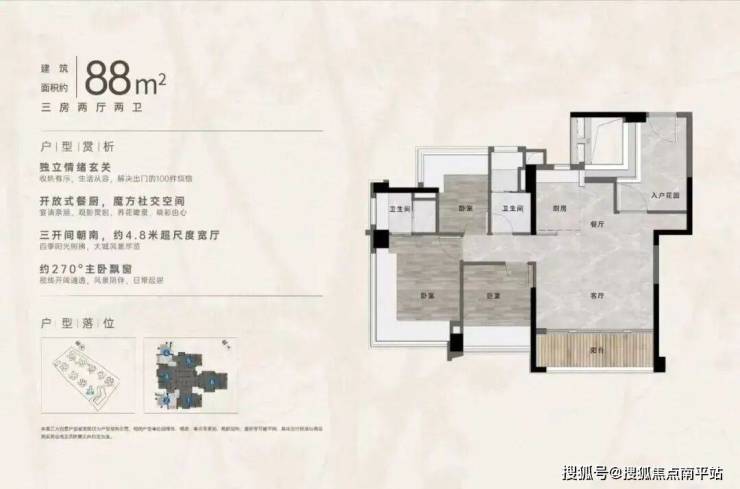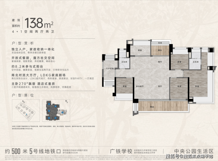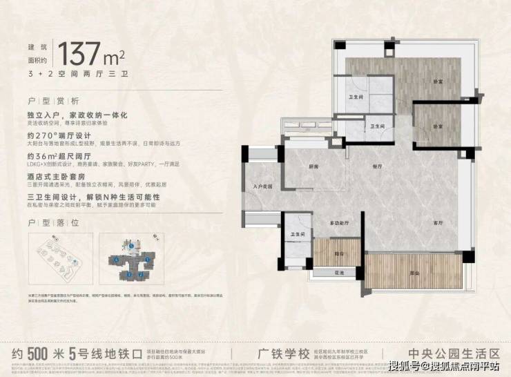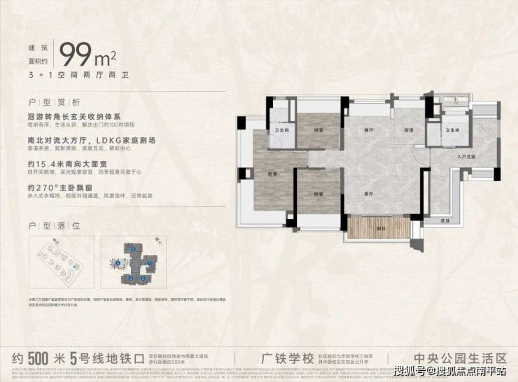 “中央公园”,紧邻大脚印公园,距离地铁约500米,紧邻学校、酒店,户型涵盖75-88㎡三房,105、125、142㎡四房。