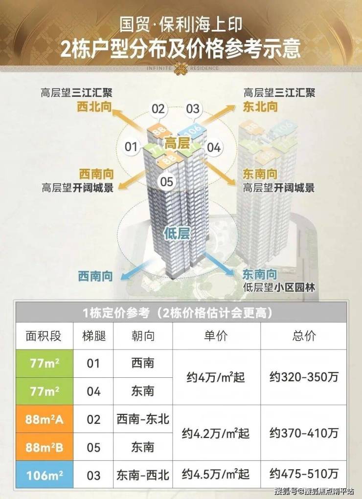 西南向价格最低, 约320万起。东南向主卧可望江,中间楼层4万出头,顶楼接近4.3万,近330万。