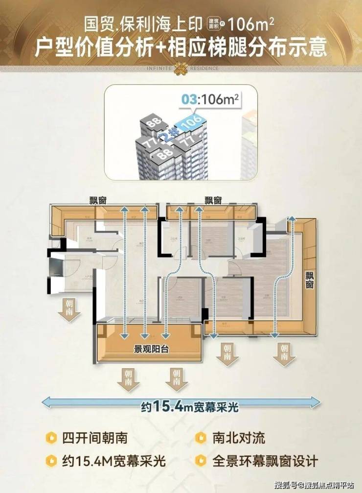 建面约106㎡户型 ,全屋超核南向资源,打造 约57㎡一体化对流通厅 、 约26㎡环幕主套 ,拿出全维超越同级的居住享受。