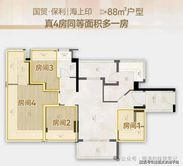 88㎡ 4房2卫: 把四房门槛卷到了90平以内,还是南北对流的单边位!