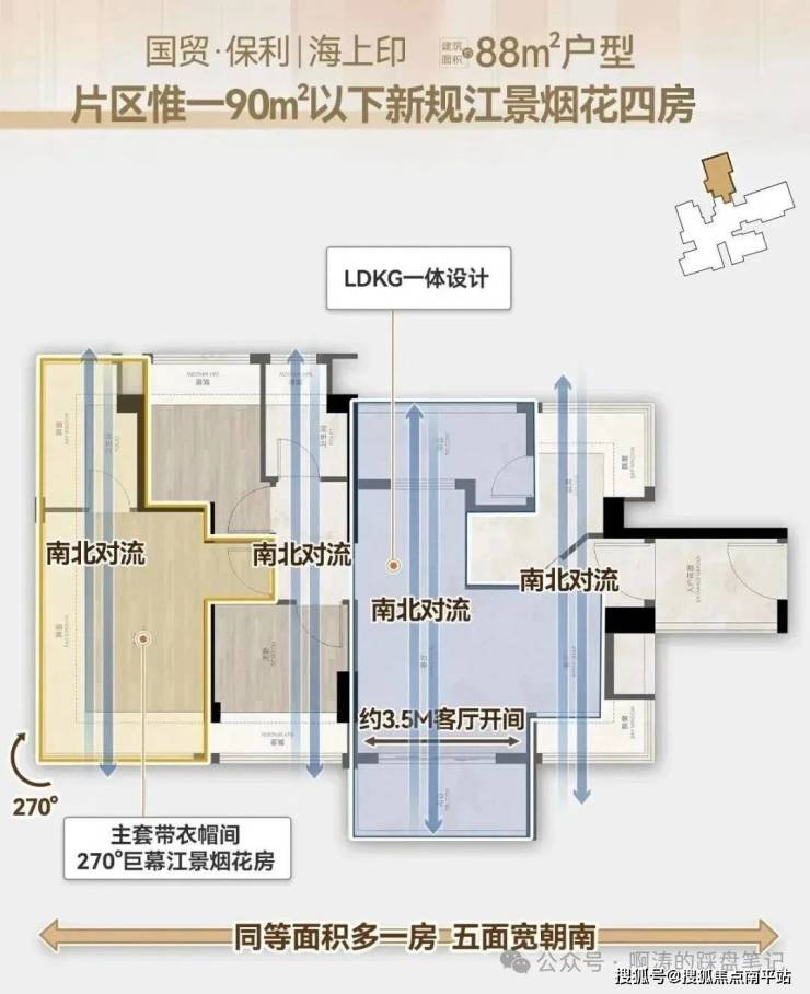 建面约88㎡户型 ,南向对流五开间,实现 2-4空间可变式布局。 更享跨代际 新规得房率, 比同等建面的 三代宅 多出一个 大次卧 ,比 二代宅 多出一个 客厅 。