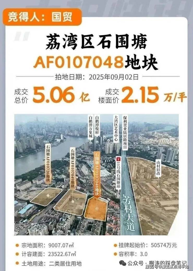2025年9月2日,位于荔湾区石围塘地铁站旁的一宗宅地成功出让。
