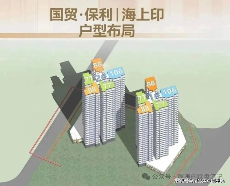 1栋户型分布一致,主打建面约77-88-106㎡三四房,总计250户 。