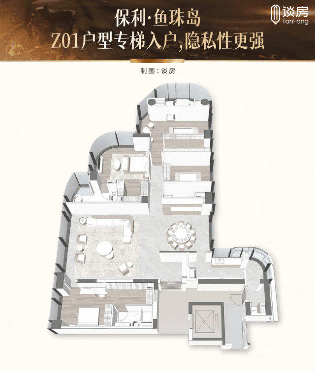 如果说Z03是这座岛的“驾驶舱”,属于野心与视野; 那建面约313㎡的Z01,则是另一种维度的占有——私密与专属。