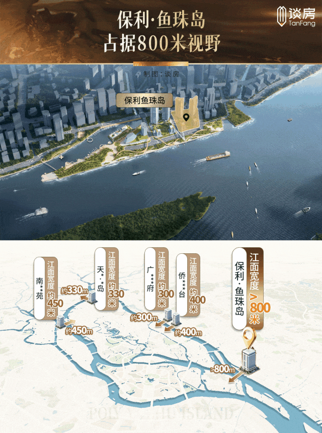保利鱼珠岛,则将这一 尺度拉升至超800米,最宽处近1000米。