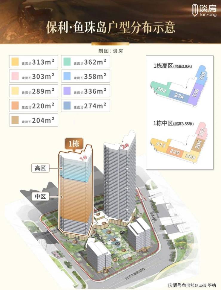 保利鱼珠岛1栋高50层,户型分 中高区分布,均是大平层设计,面积段在建面约204-362㎡。