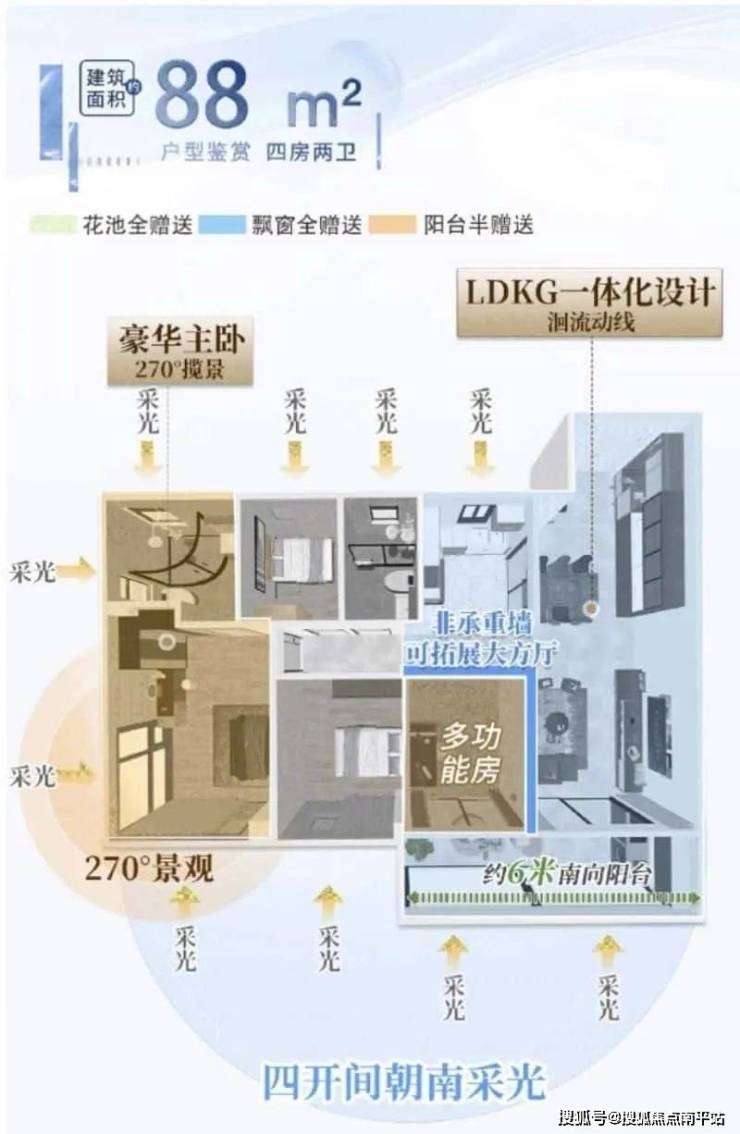 (2)88-91㎡四房两卫:6米南向阳台,次卧可放1.8米大床,对比同面积段产品多出一个房间。