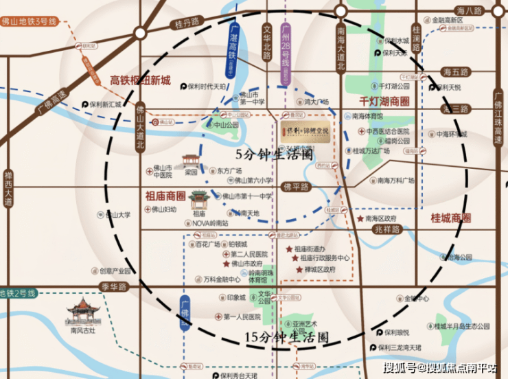保利锦鲤堂悦落子于禅城祖庙板块,恰处于禅桂交界的黄金节点,可同时享受祖庙与千灯湖双城芯的资源辐射。项目直线距离千灯湖约1.5公里,周边3公里范围内覆盖12大商业综合体,包括南海万达广场、岭南天地等成熟商圈。