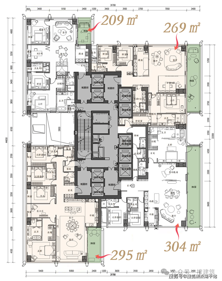 ▲建面约209㎡、269㎡、295㎡、304㎡户型示意图