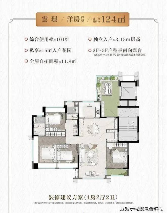 配备15㎡入户花园及2-5层南向露台,层高3.15米,空间尺度媲美别墅。