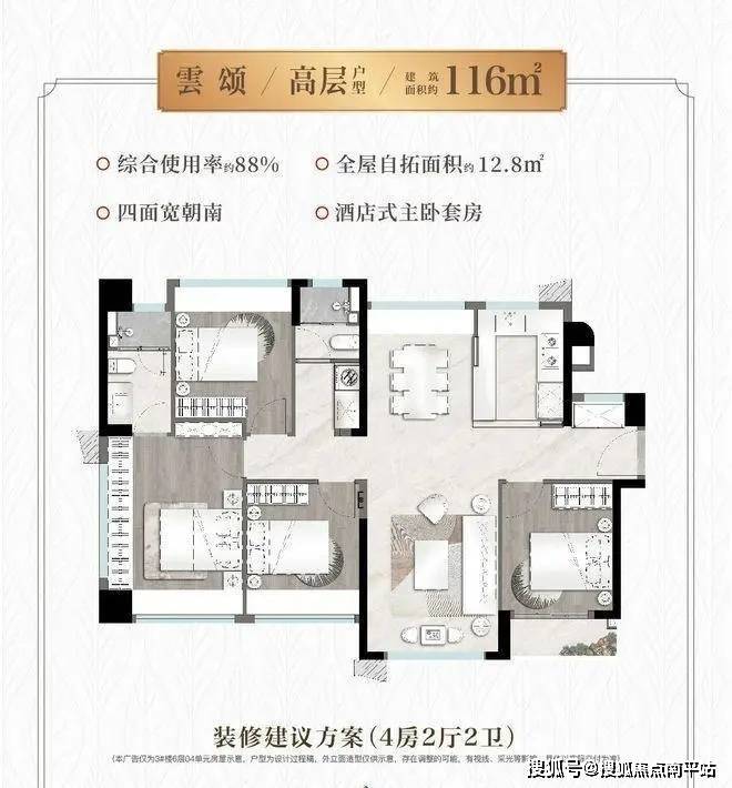 116㎡四房两卫:L型跑道阳台,部分房源可俯瞰海景,得房率88%。