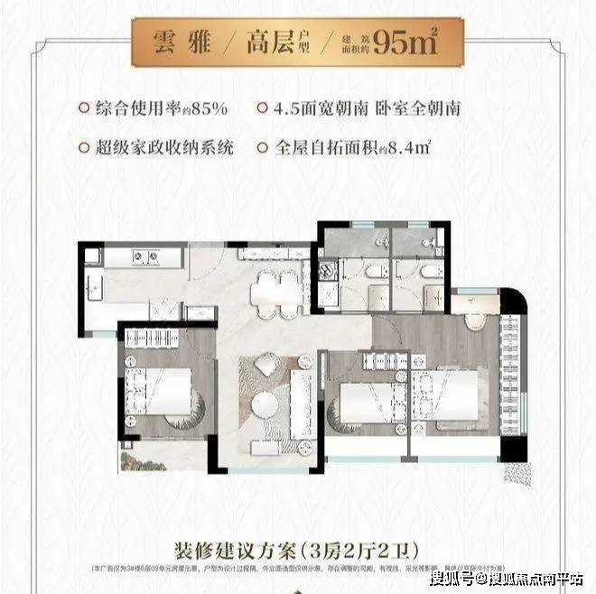 95㎡三房两卫:4.5开间朝南,主卧套间三面采光,得房率85%-89%。