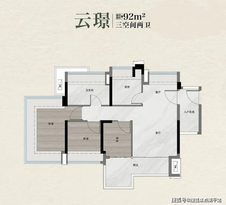 建面92㎡三房两厅两卫,售价245-265万元,西南朝向,南北对流设计,全屋没有暗房,采光通风都不错,自带800库收纳系统,大件物品也能妥善存放;