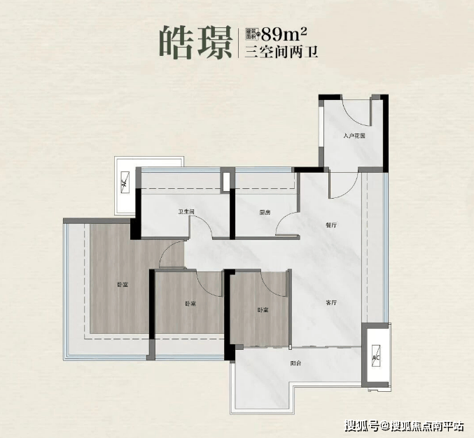 建面89㎡三房两厅两卫,总价238-250万元,东南朝向,L型双开间阳台能改造成约4.4㎡的+1房