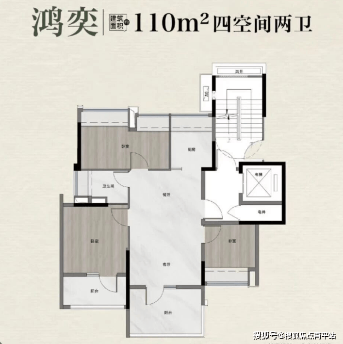 板楼户型更侧重改善体验,建面110㎡四房两厅两卫(中户)总价295-320万元,正南朝向,类四叶草布局,每个房间都相对独立,家庭成员居住互不干扰;