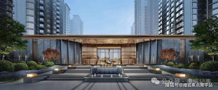 · 名门之礼——大门以中国传统的“卷轴”为灵感,以高约9米、长约90米的超大延展面铺陈开来,通过“弧形建筑、高定奢石”营造出尊崇的归家仪式感。开敞的活力广场,五星级酒店同款特色迎宾水景,奠定奢华的质感基底。完成从城市空间到社区空间的有序过渡,亦实现洗礼式归家