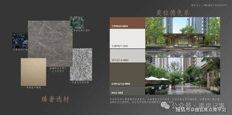 · 单元入户——单元门以温德姆灰石材+紫山水石材+香槟色金属作为主要材质,迎宾景墙墙面地面用大板砖、威尼斯棕整面岩板加以香槟色金属和灯带装饰,增加了高级感同时缔造了十足的归家仪式尊崇。
