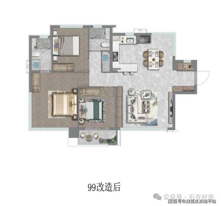 • 99㎡3+1房两卫(边套):首改家庭的理想之选,南北通透设计搭配四面采光,空气对流无死角。270°全景主卧与餐厅,拓宽观景视野的同时让采光更均匀,灵动的“3+1”空间可按需改造为书房、儿童房,得房率约92%,兼顾实用性与成长性。