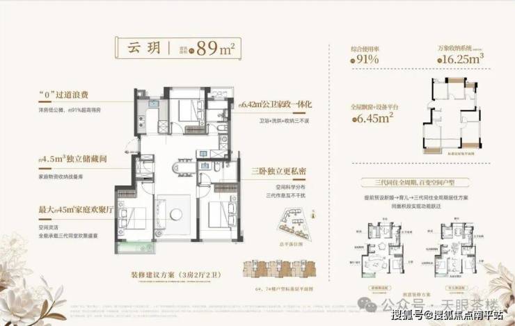 如建发璞云89平窗内实用面积约80平;传统户型89平窗内可用面积(按使用率80%、过道冗余面积4平算)约为67平,多出13平的空间,让整个房间的分区功能面积、收储系统最优化,可节省大几十万的成本。