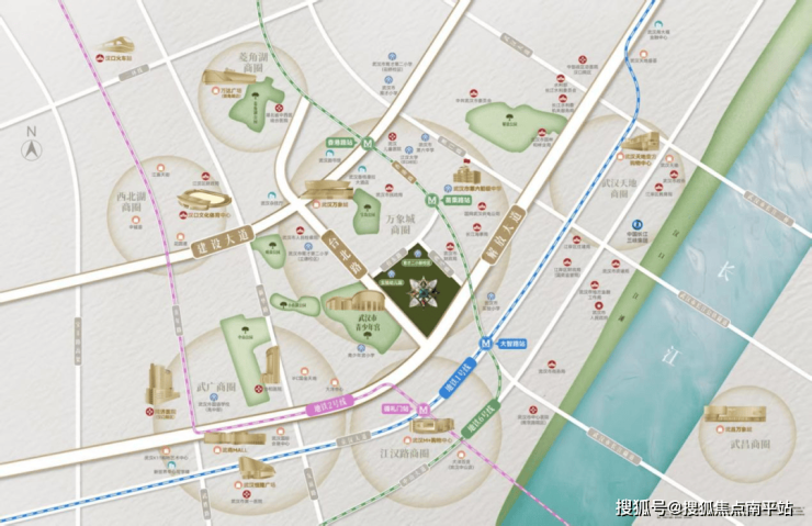 项目隔壁就是武汉青少年宫、宝岛公园。距离地铁大智路站直线距离约300米,循礼门站直线距离约600米。约1.2公里到万象城,约1至1.5公里到国金中心和武广,约2.8公里到武汉天地。