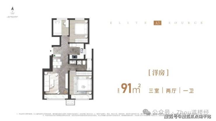 91㎡通透三室一卫全明户型