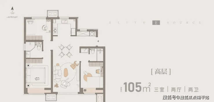 边户105㎡通透三室两卫全明户型,总价380-390万左右