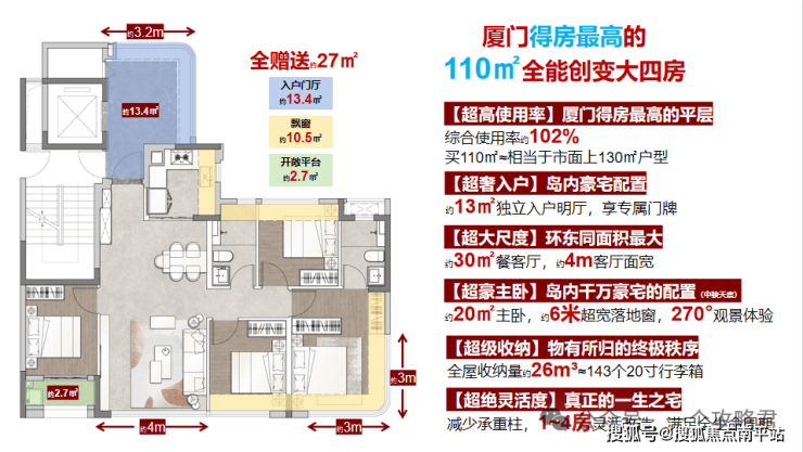 全厦门得房率最高的新房110㎡,四房两厅两卫,综合使用率102%。