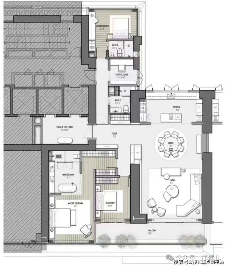 双入户动线、约3.5米层高、约90㎡的客餐厅搭配270°全景环幕落地窗,再加上约19米长的L型转角阳台,拥览CBD的万象繁华。