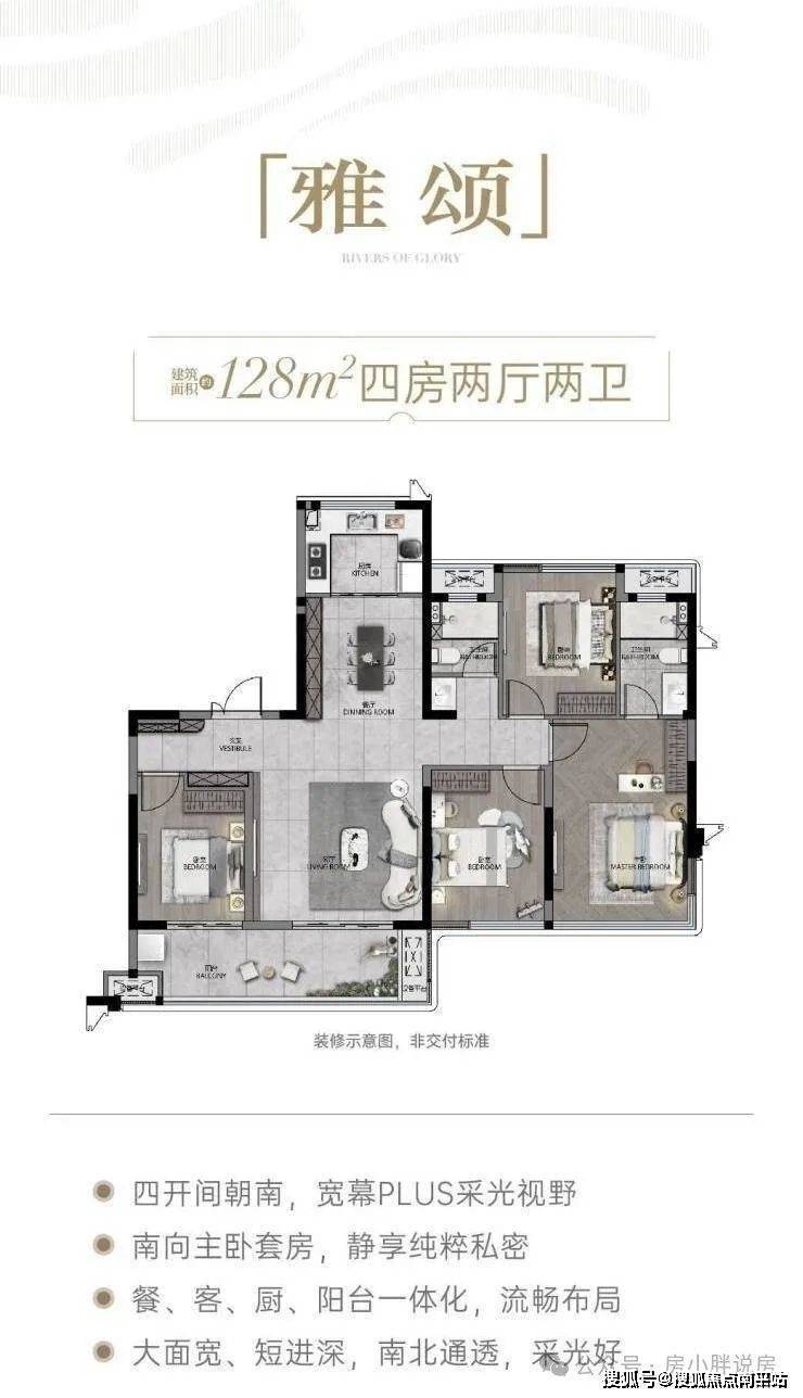 128㎡四房:四开间朝南,主卧套房带 270° 转角飘窗,餐客厅一体化设计,得房率 85%;
