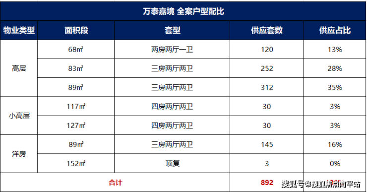 户型分布:1#、2#、3#、5#高层均为2梯4户,中间套为83㎡三房,边套为89㎡三房;6#高层为3梯6户,中间套均为68㎡两房,边套为89㎡三房;7#、9#、10#洋房均为1梯2户,都是89㎡三房户型;8#小高层为2梯2户,户型为117-127㎡四房。