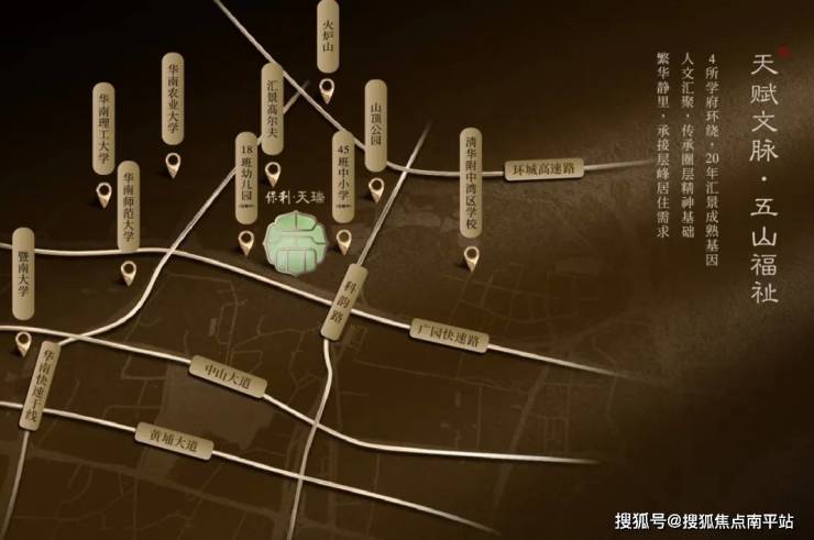 项目位于天河五山汇景新城板块内,珠江新城和琶洲金融城两中轴间的核心位置,楼盘身后就是汇景20年醇熟的圈层配套,新中式园林。