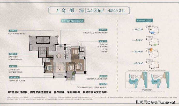 建面约139㎡户型,约107%超高得房率, 媲美传统160㎡户型空间体验。