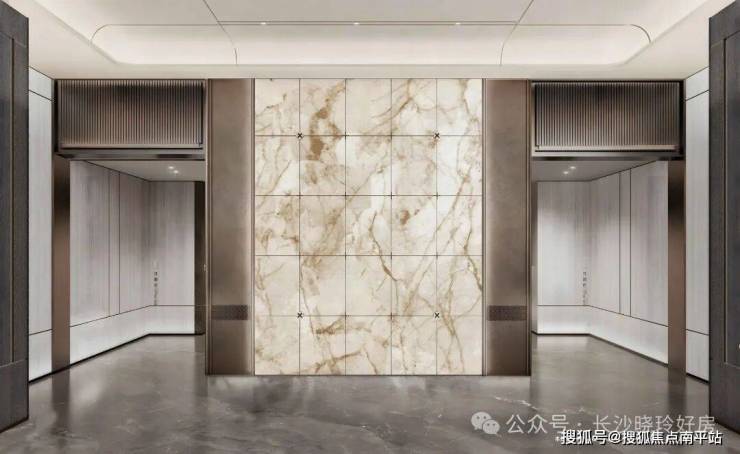 酒店式精妆双大堂设计,挑高敞阔格局,引入造型背景墙,金属与石材结合,点滴之间皆为金茂匠心。专属电梯厅,高规格入户仪式。