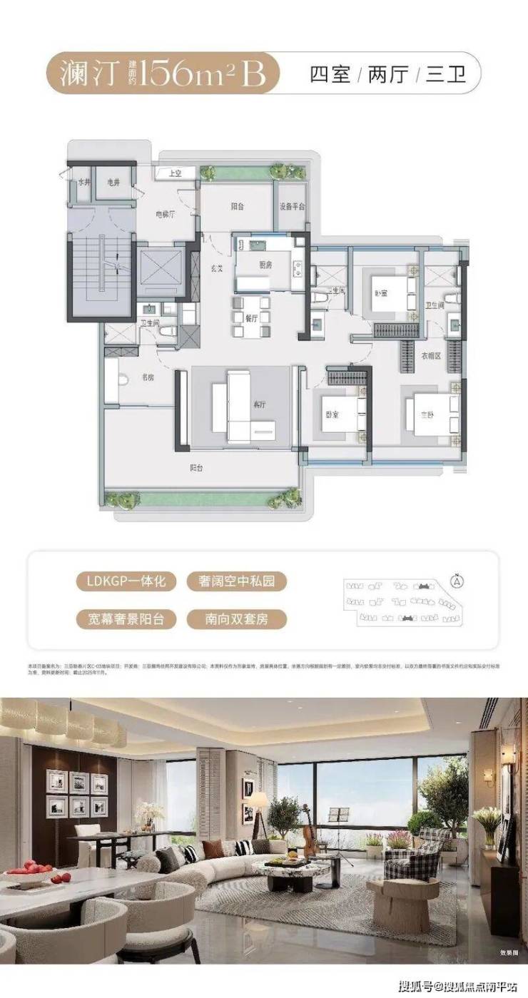 澜汀156㎡B(四室两厅三卫):延续“浮岛全景舱”核心设计,以“全明通透+灵活分区”为亮点。采用四叶草布局,四个房间分布于四角,避免动线交叉,保障每代人隐私。南向三开间设计搭配约7.2米贯通式阳台,将临春河景与园林风光引入室内。主卧套房配备独立卫浴与步入式衣帽间,客卫干湿分离,厨房连接生活阳台,兼顾居住舒适度与实用便利性,适配多孩家庭或三代同堂旅居需求。