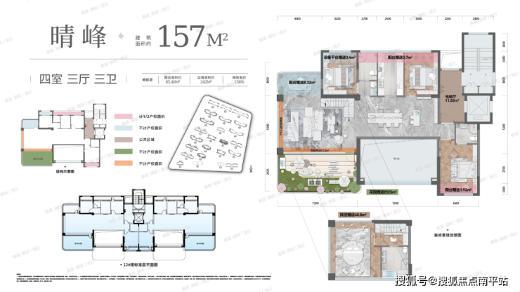 全域:占地面积约4.3万㎡ 综合容积率约1.4 总建筑面积约11.7万㎡ 共648户