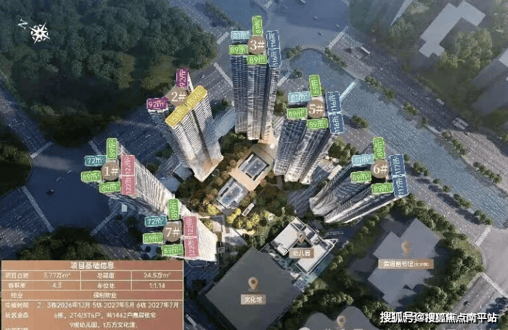 项目采用围合式设计,6栋47层高塔楼设计,小区自身配建有文化体育场馆和幼儿园,除了2#楼王是两梯四户,其余均为三梯六户,8#是5层高的文化馆,9#是配建3层高的幼儿园。