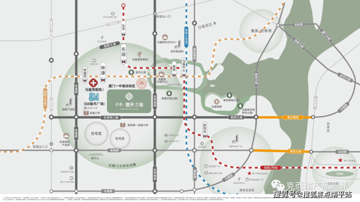 项目位于厦门市海沧区马銮湾片区,是集海域/岛屿/TOD/湾区,以城市功能为本打造的湾区,是厦门“桥、隧、轨”三通的新城板块,板块内配套地铁东瑶站(2号线),周边三轨交汇在马銮中心站,地铁线网密度为福建省前茅。片区投入千亿规模配套,被称为高颜值花园之城,现代化产城融合新高地。