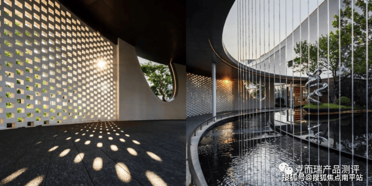 将“双坡曲”“燕尾脊”等具有代表性的海沧新垵文化符号运用在主入口展示区建筑上,结合几何感的曲线构图,塑造出片区的形象坐标,而东侧起翘的方向也正是海湾的方向。古居中的花墙也作为建筑立面的设计元素,花墙所形成的的光影效果和若隐若现的朦胧感,增加光线的变化。而花墙自身作为一种传统民居的设计语言,也增加了建筑古朴的韵味。