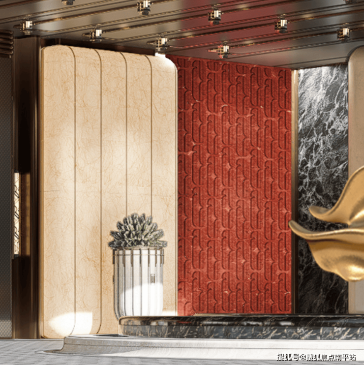 标记3这个位置应该是结合了天奕的产品系列LOGO和某些特殊工艺的一块饰面板,工艺是啥效果图确实看不出来(大概率是奢石),结合跳出的红色应该是想呼应一些湖湘的历史元素。