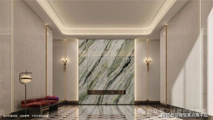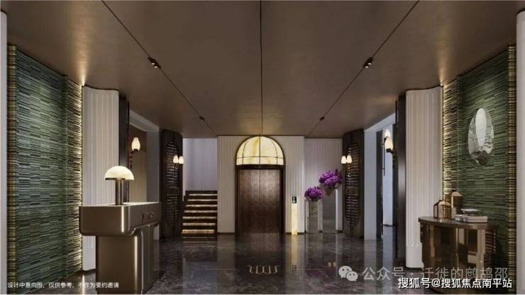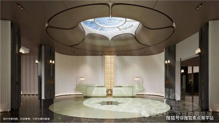 入户大堂: “百合光厅”以百合造型穹顶、奢华用材营造璀璨的归家第一印象;单元门厅采用“藏风聚气”的祥瑞设计。
