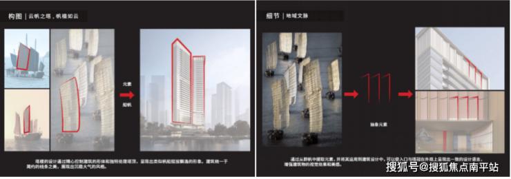 GOA操刀立面设计,在呼应琶洲CBD总部形象基础上,增添了属于华樾自己的建筑文脉特色。本项目故事线取自广州千年商都的城市文化,以及琶洲历史上丰富的船港文化,项目以“云帆之塔”为造型立意,整体塔楼呈现出类似帆船挺拔飘逸的形象,塔冠的塑造呼应了“帆”的造型意向;而中间避难层,则以空中花园的形式与裙房屋顶花园相呼应;底部裙房设计,则是从船的船舷汲取灵感,将船舷提取的元素与建筑的曲线结合,打造了退台式的甲板花园。