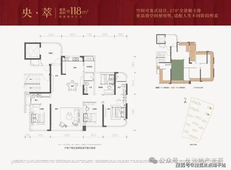 118㎡做四房三卫:得房率超113%,套内面积约133㎡,客厅开间5米!阳光洒满屋子的感觉,主卧还是270°全景窗,我的少女心动了。