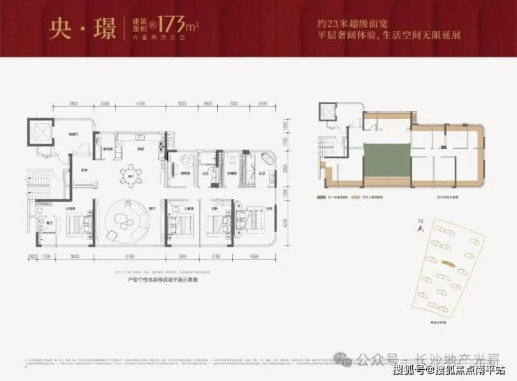 173㎡平层大宅:得房率超114%,套内面积约199㎡,约23米面宽,六室空间,五开间朝南,四个卧室朝南,适合三代同堂的改善家庭,私密性做得很好。