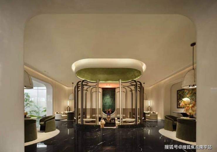 续写着接待厅开启的场域篇章,于光影交织、材质对话间,营造出一方兼具烟火气息与雅致意境的交流场域。不同材质光泽的叠加,构建出强烈的碰撞对立感,以此呼应闽都文化中传统与现代的交融。沉稳的黑色地面基调上,介入绿色与白色的软体家具,以柔和的质感与温润的色泽,为空间注入鲜活的烟火。