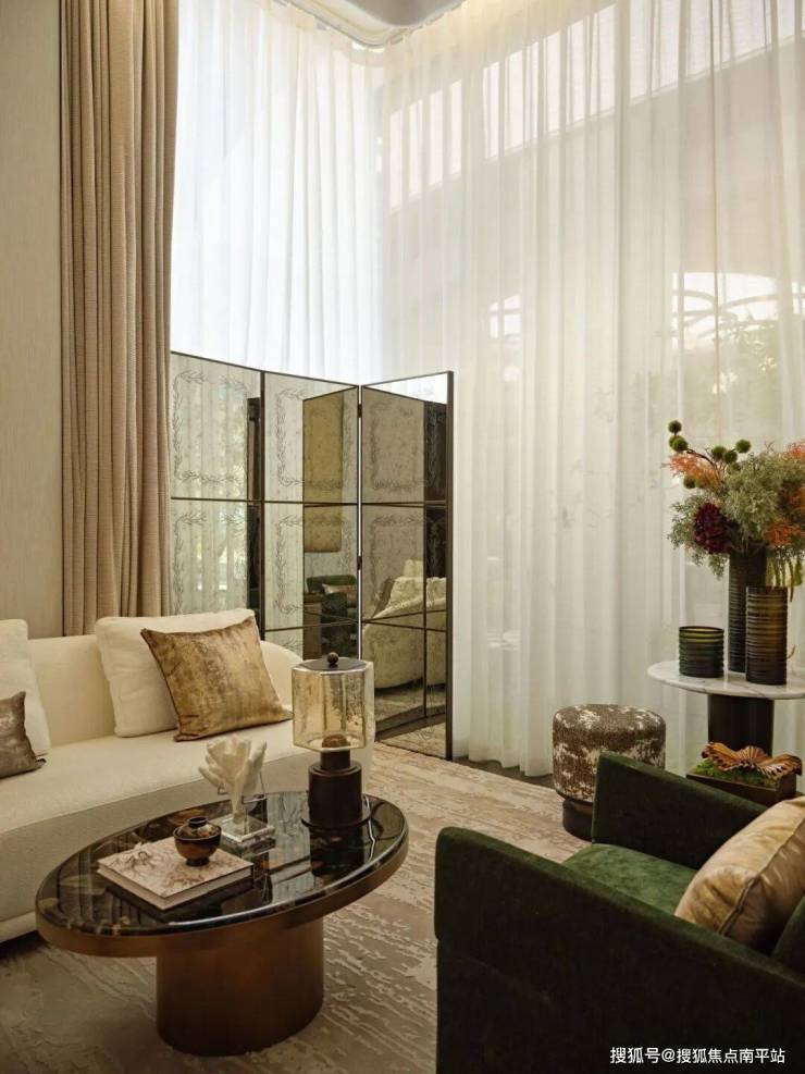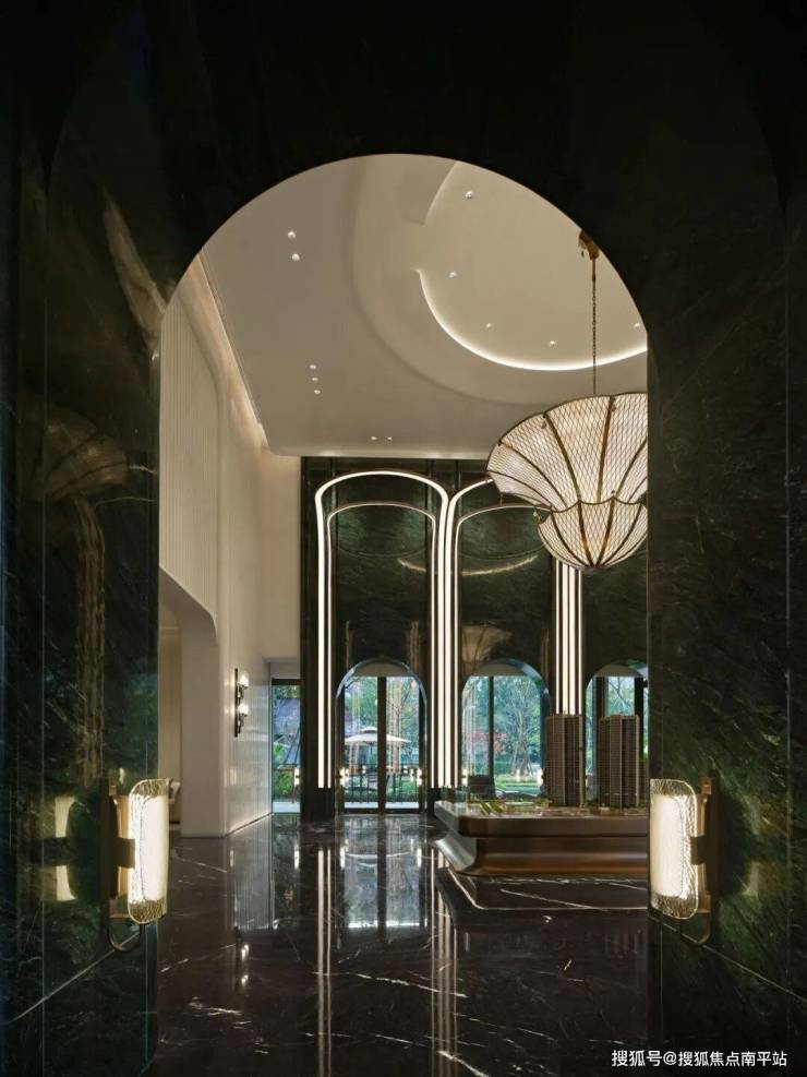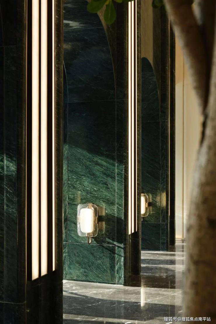沙盘区兼具场域美学与功能价值,在繁花似锦的生命语境下,为来访者开辟出一方通往丰盈生活的精神过渡空间。宏大而有序的空间格局下,四周的墨绿色大理石墙面如同一幅沉稳的画卷底色,深邃而内敛,衬托出中央沙盘区域的精致。