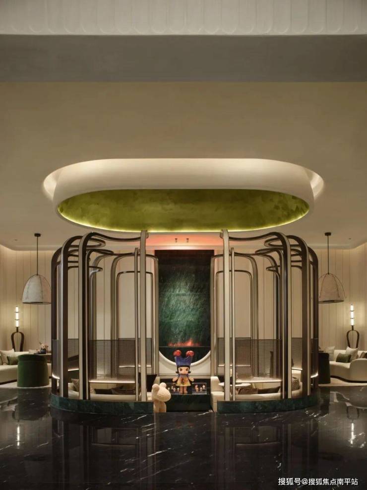 顶部的绿色纹理天花板如漂浮绿云,与下方区域呼应,柔和曲线与硬朗框架线条对比,增添空间层次与动态感。围合空间内的精致玩偶摆件与艺术装饰,增添趣味与人文气息,让洽谈者感受闽都文化的细腻生活情趣。