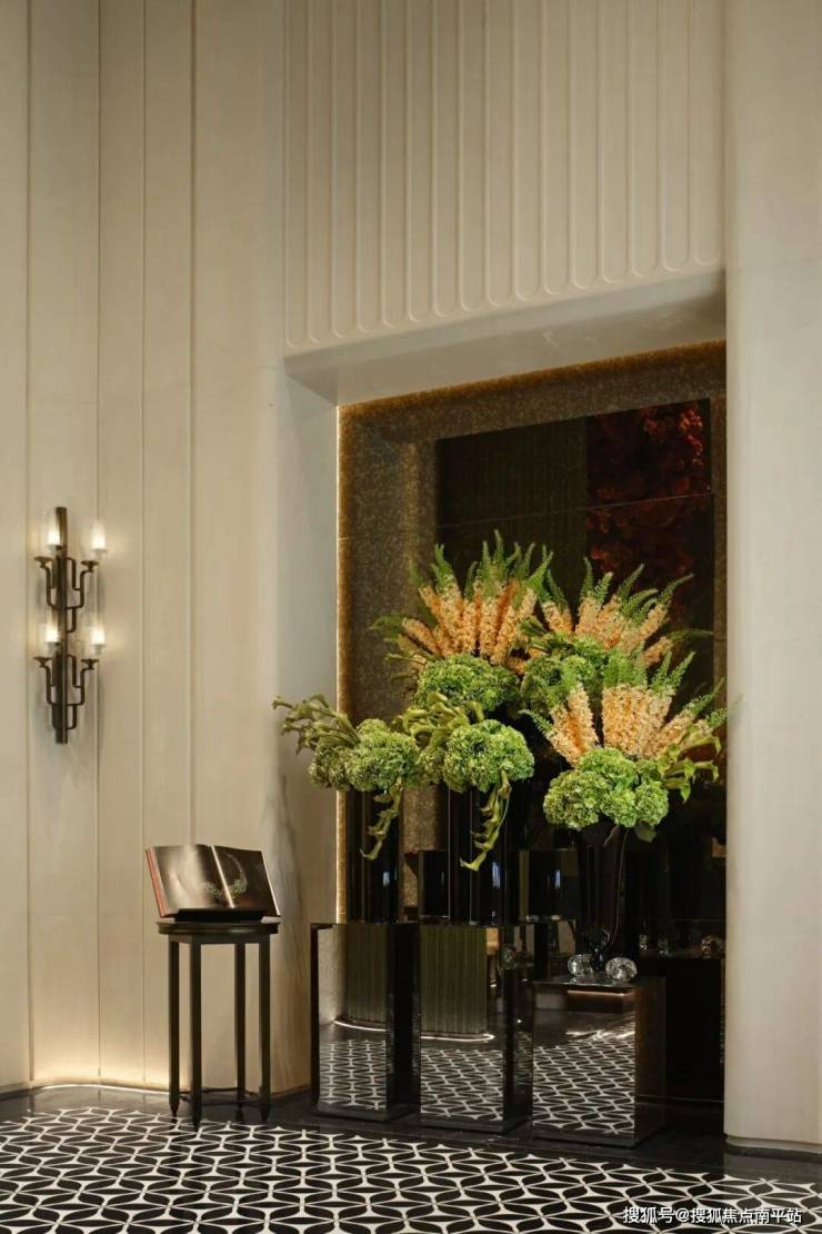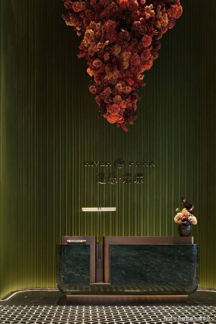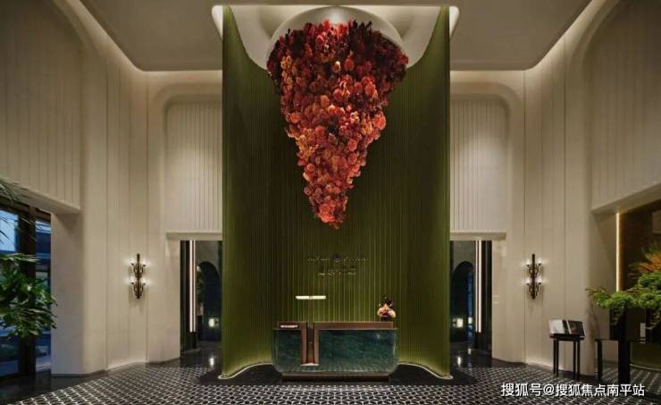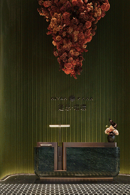 以红色为主色调的花卉如瀑布般倾泻,凝聚了榕城的自然之美,与静态的硬装结构形成动静结合的美学效果,为空间注入活力与变化。
