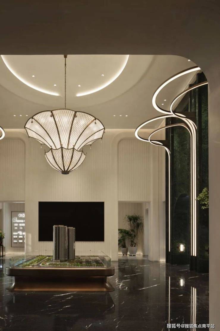 流畅的弧形线条与柔和的灯光带相得益彰,既赋予了空间动态的美感,又巧妙地引导着视线向沙盘聚焦。