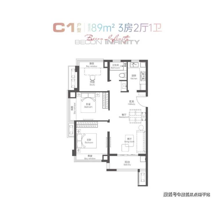 其中89㎡3房1卫,方正布局、得房率高,全明南北通透,270°采光,三个卧室都带飘窗,客餐厅阳台一体化,可PK市面上110㎡户型;