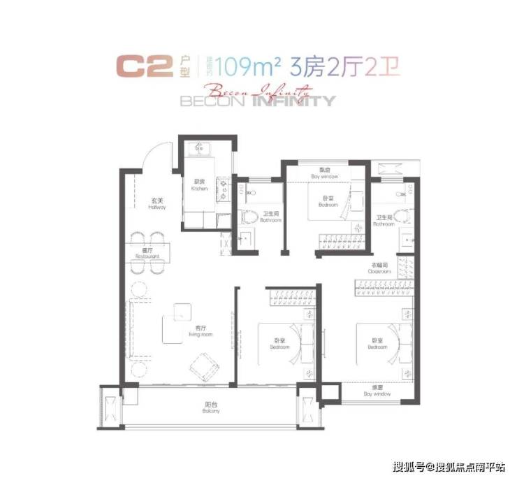 109㎡3房2卫,三开间朝南,整体周正,全明南北通透,6.4米瞰景阳台,主卧套房带独立卫浴+衣帽间+飘窗,奢阔居住,可PK市面上130㎡户型;